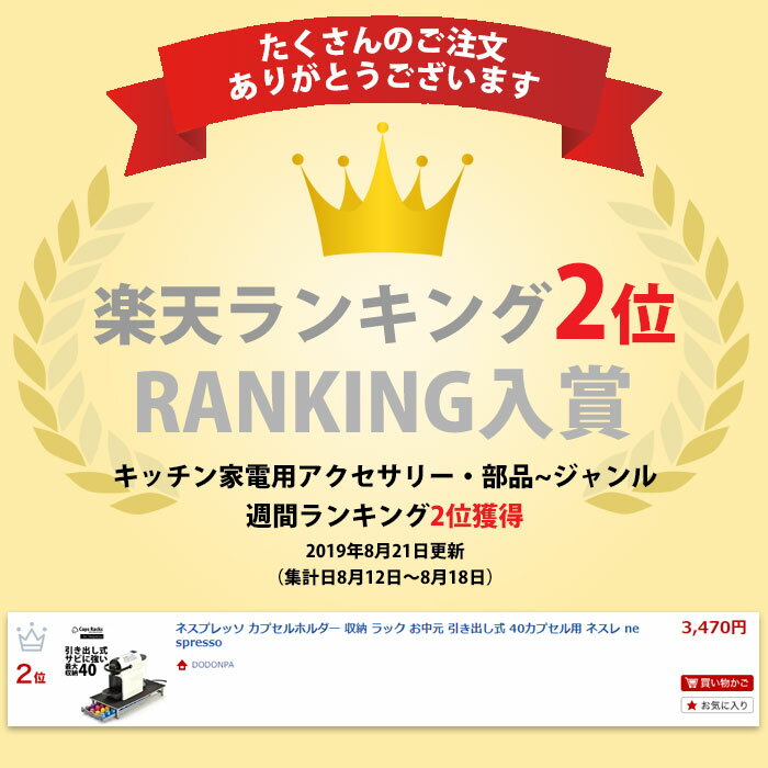 【商品バリエーション】 同メーカーの商品ラインナップは、 ドルチェグストカプセルホルダー回転式24カプセル用 ドルチェグストカプセルホルダー回転式32カプセル用 ドルチェグストカプセルホルダー引き出し式36カプセル用 ネスプレッソカプセルホルダー回転式40カプセル用 ネスプレッソカプセルホルダー引き出し式40カプセル用 がございます。